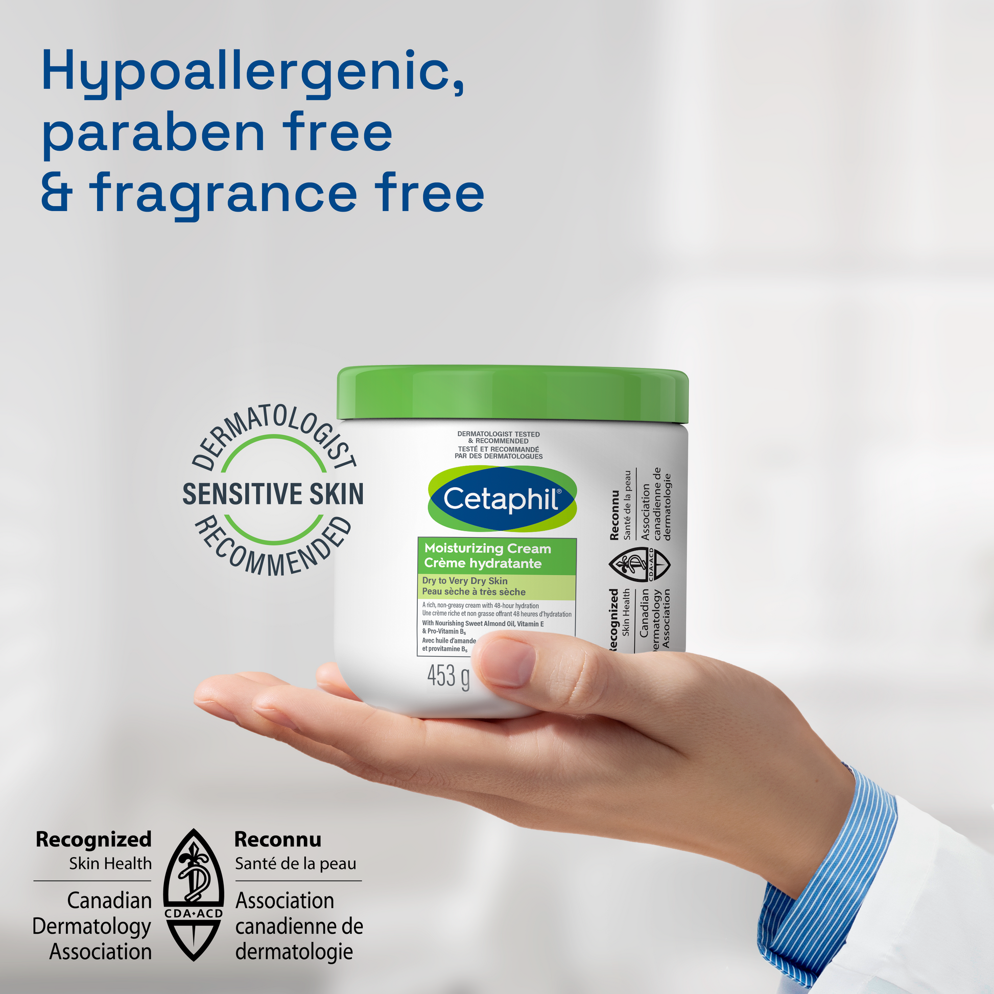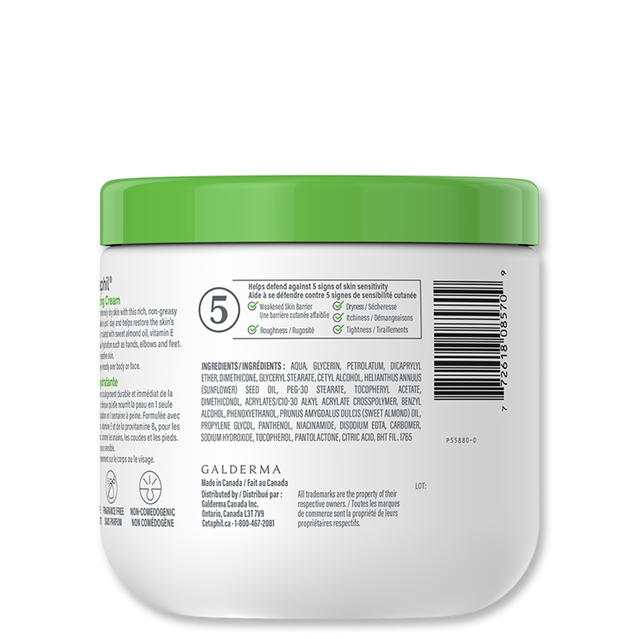 La riche formule spéciale de cette crème non grasse contient un mélange de niacinamide, de panthénol et de glycérine hydratante. Enrichie d’huile d’amande douce, cette crème quotidienne éprouvée en clinique nourrit la peau en 1 jour seulement et restaure la barrière d’hydratation naturelle en 1 semaine à peine pour un soulagement durable et immédiat. Protège contre 5 signes de la sensibilité cutanée, soit une barrière cutanée affaiblie, la sécheresse, la rugosité, les démangeaisons et les tiraillements.